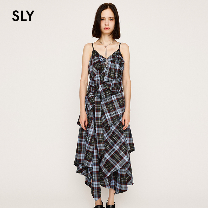 SLY2025早秋新品 0341 甜辣复古格纹不规则下摆吊带连衣裙030IAZ33