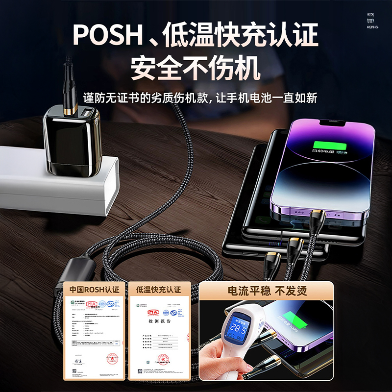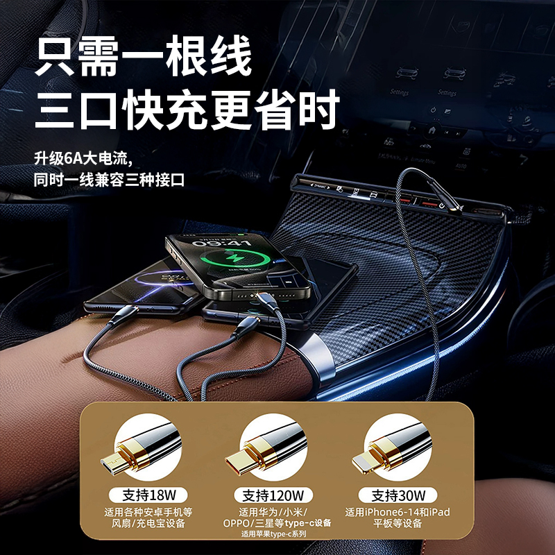 充电线三合一数据线一拖三6A手机车载适用于华为mate70苹果17安卓多头三头3多功能typec充电宝 顶配新快充