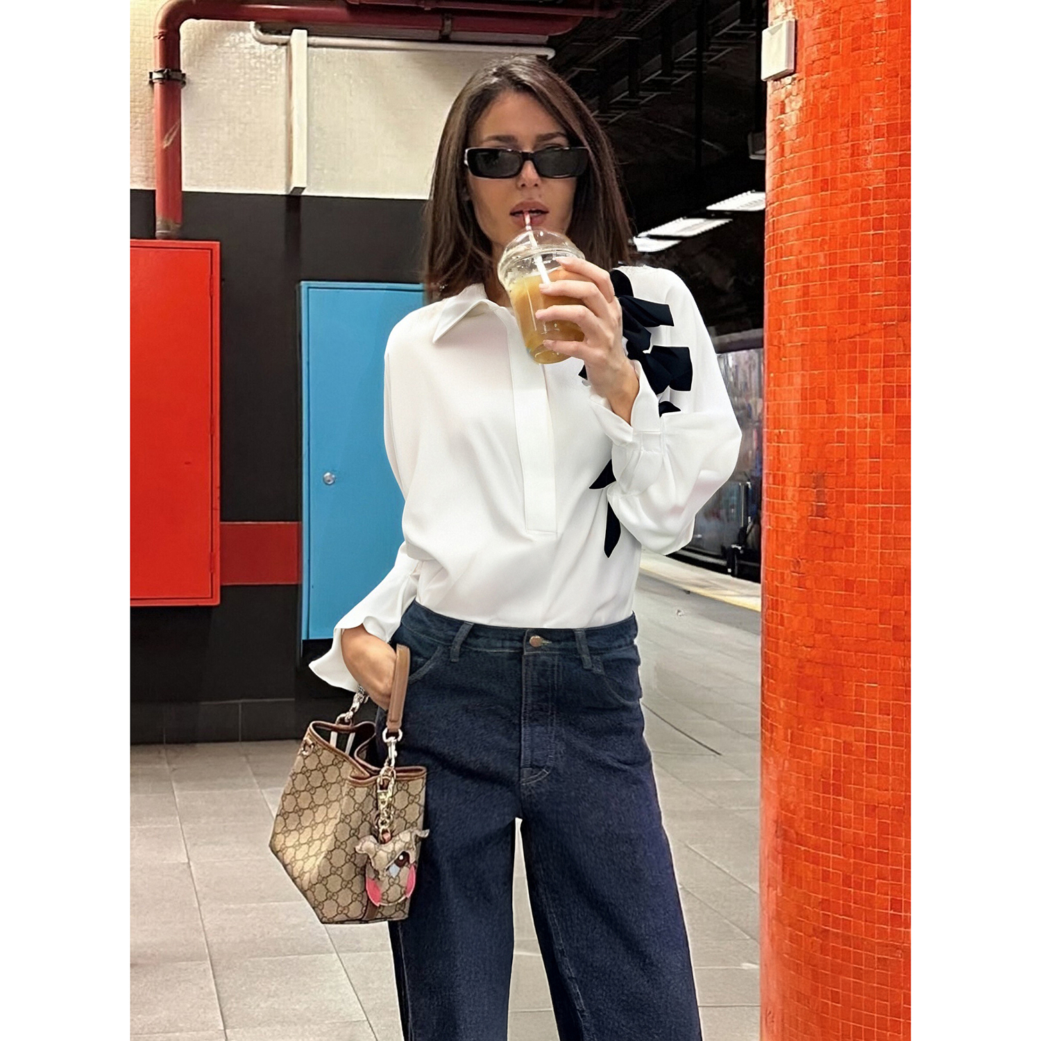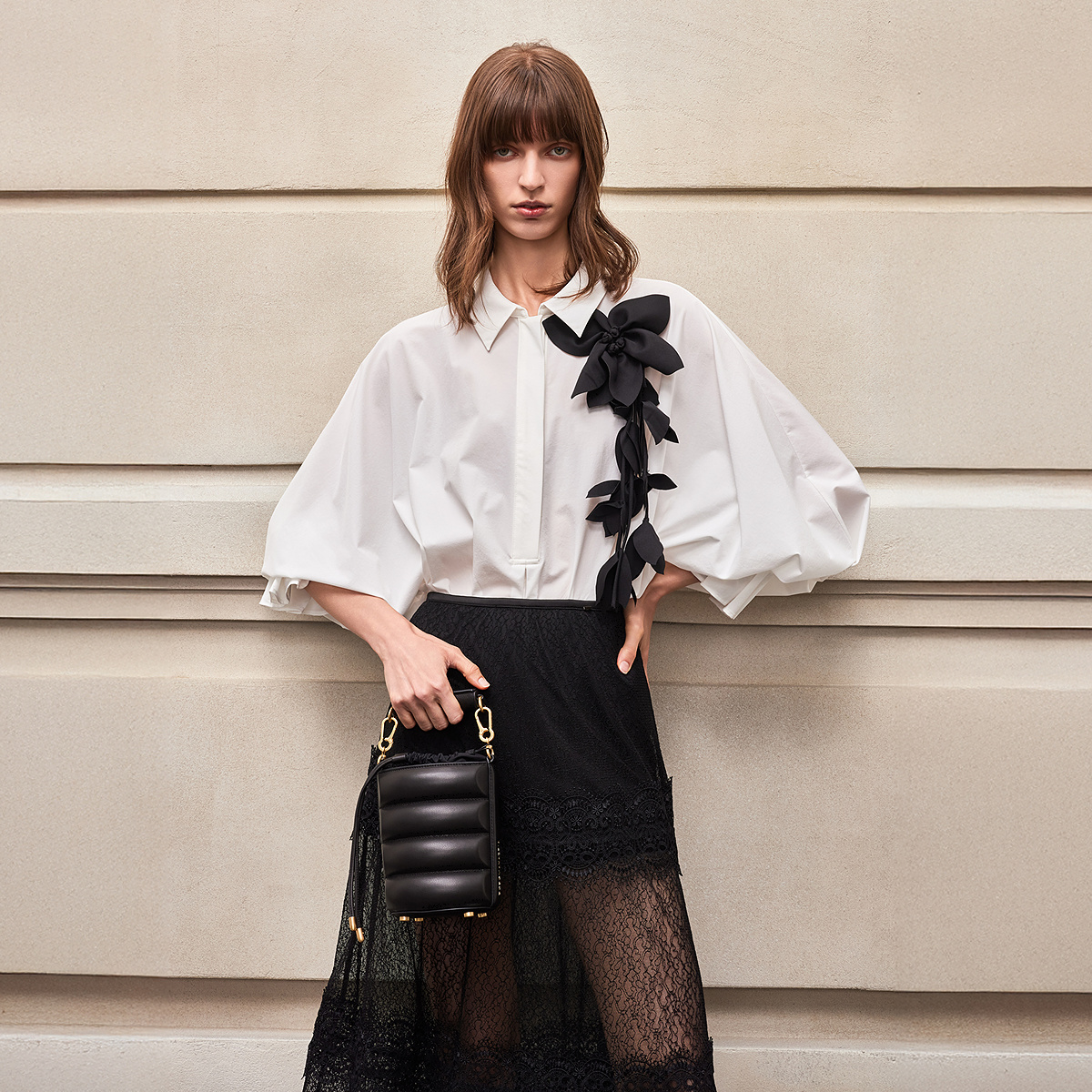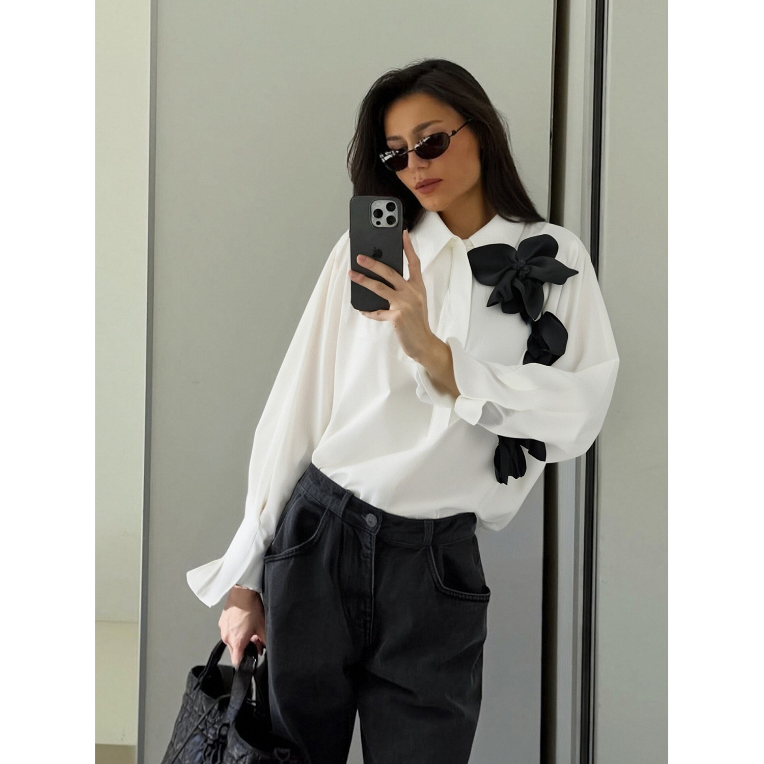 女士衬衫 BCBG新款 饰花苞袖 别致黑白拼色立体花装 上衣 简约百搭修身