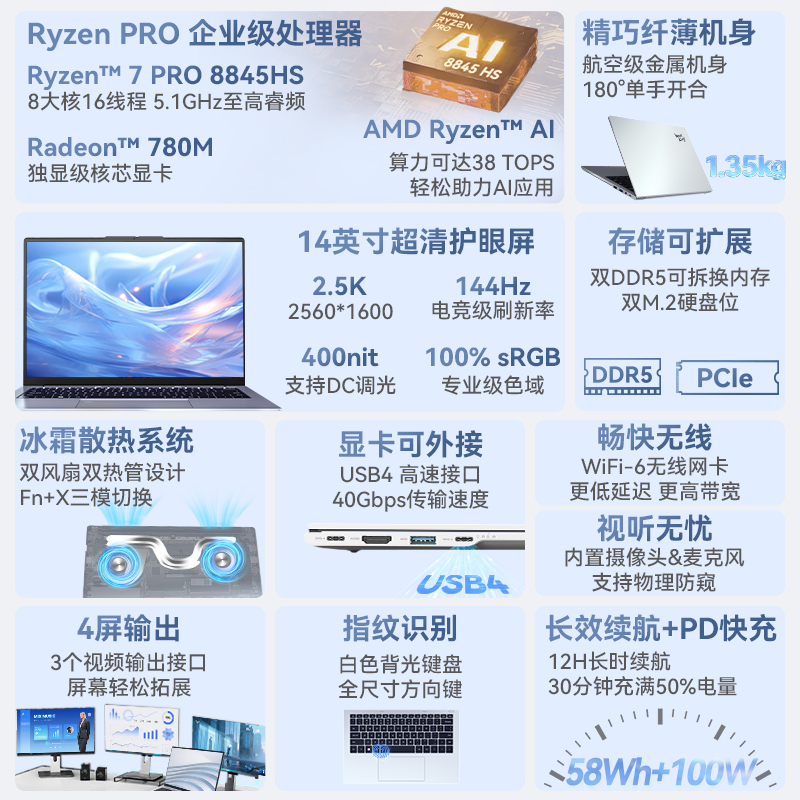 8845HS14英寸高性能AI轻薄本笔记本电脑网课学生办公 吾空凌云L14笔记本电脑锐龙R7 全国可用焕新补贴20%