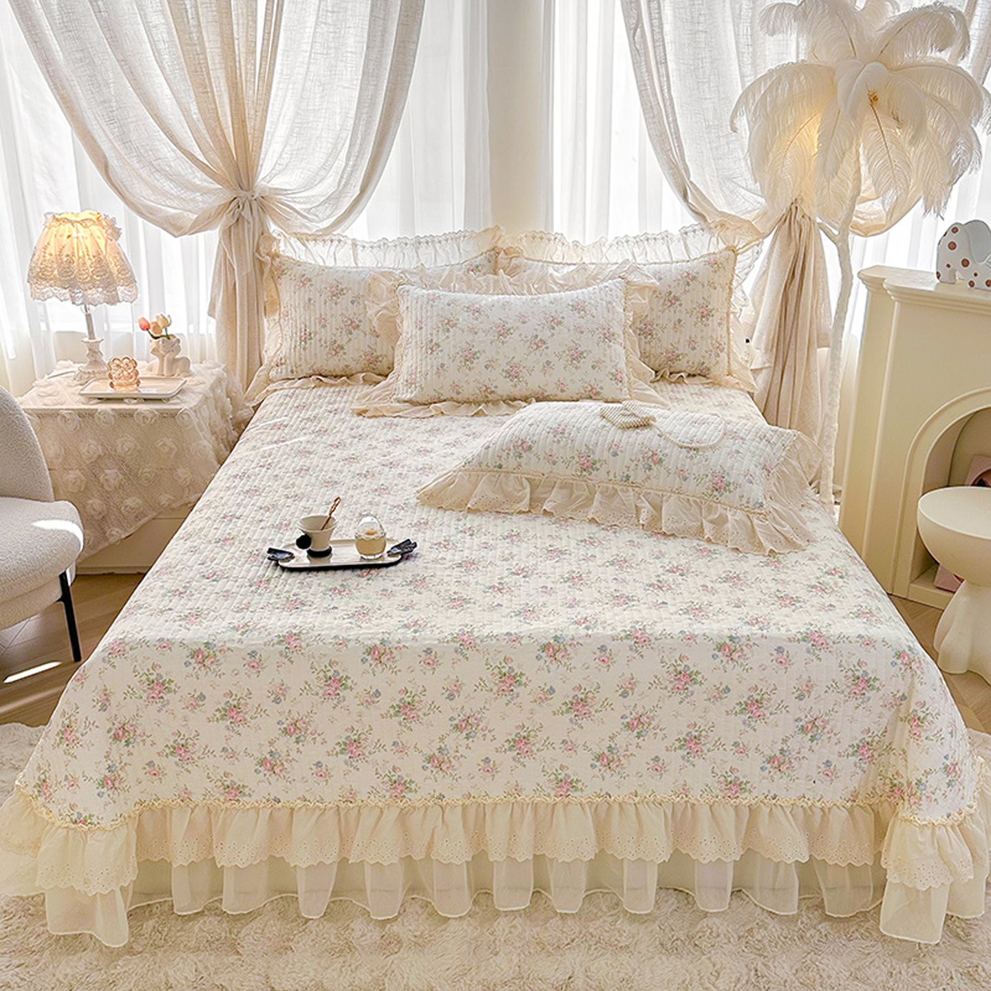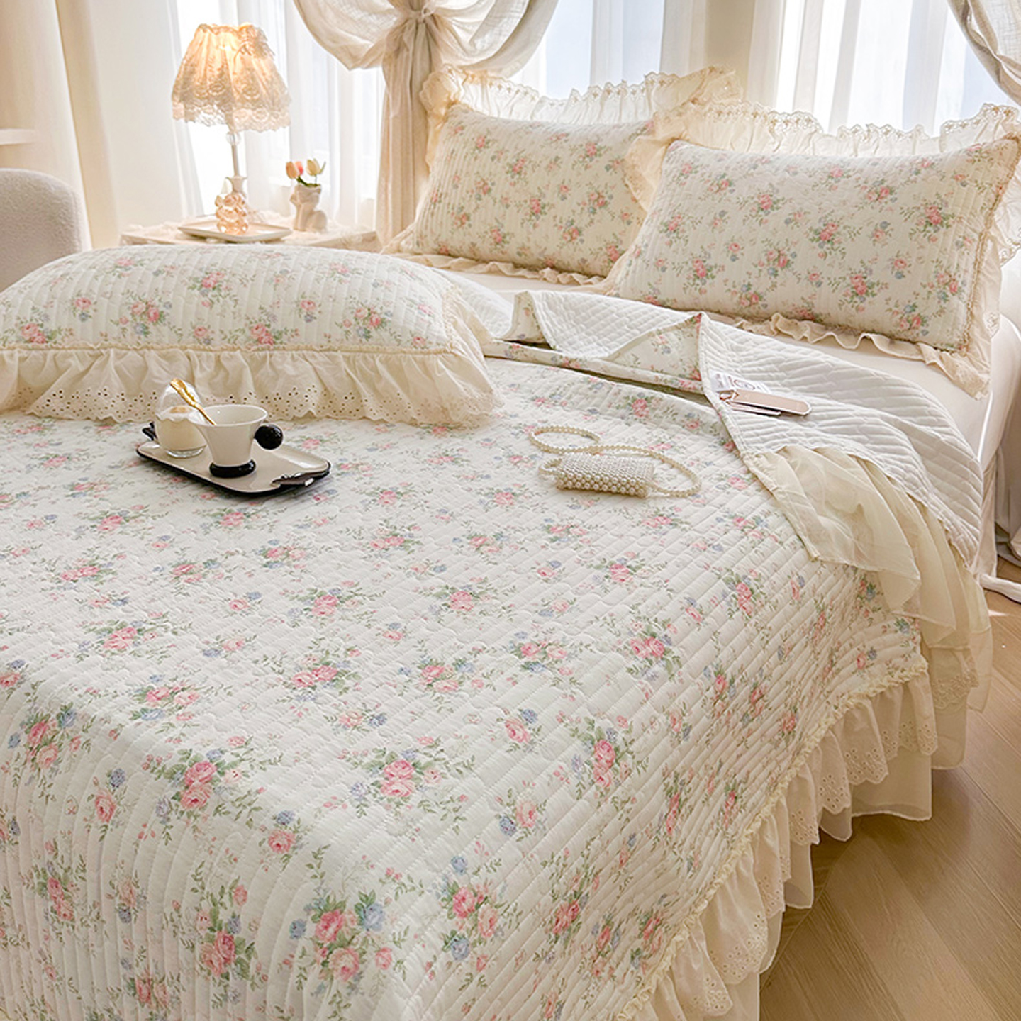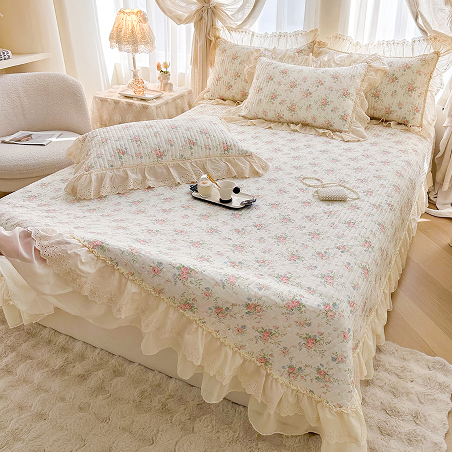 田园风小碎花全棉夹棉床盖单件100纯棉荷叶花边床单三件套四季 款