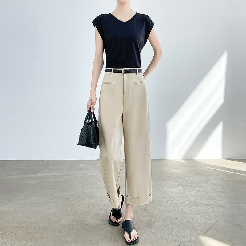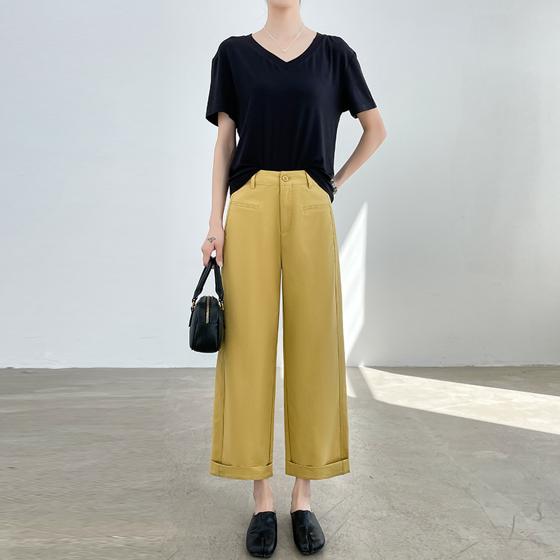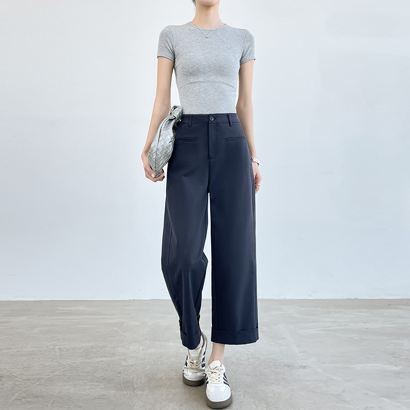 直筒休闲裤 藏青色卷边阔腿裤 高腰宽松显瘦垂感九分窄版 薄款 女夏季