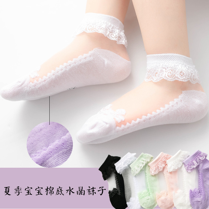 儿童蕾丝袜夏薄款 棉底 女宝宝透明水晶玻璃丝船袜冰丝白色花边短款