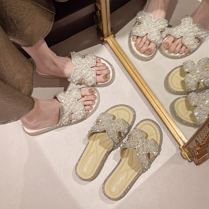 绝美凉拖鞋 外穿不累脚配裙子平底海边珍珠沙滩小香风一字拖 女夏季
