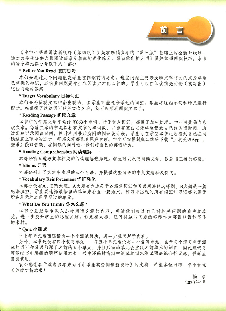 第4版 英语学习新视野丛书 初高中英语课外阅读物 中学生英语阅读新视野4第四册 上海教育出版 第四版 词汇强化阅读理解 社 附音频