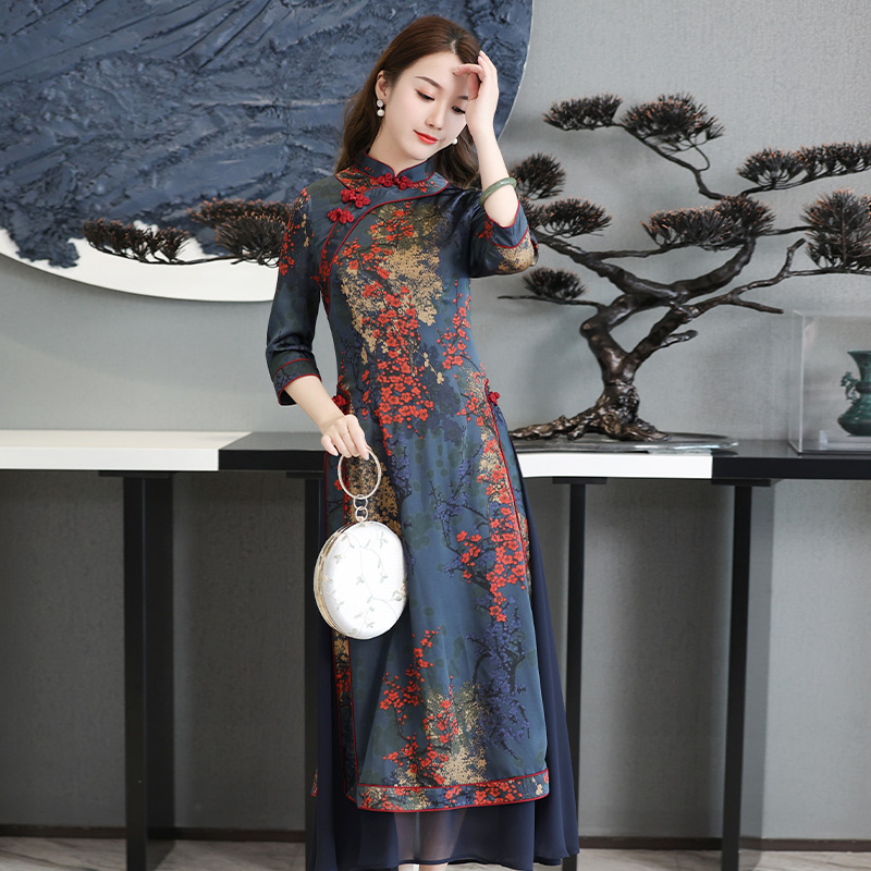 裙子 高端休闲日常长袖 如意风奥黛旗袍气质新款 改良连衣裙年轻款