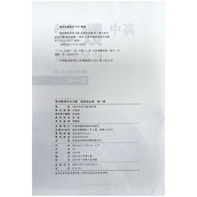 高中教辅用书高中数学补充习题 2025秋高中数学补充习题选择性必修第一册 社 江苏凤凰科学技术出版 选择性必修1 配参考答案