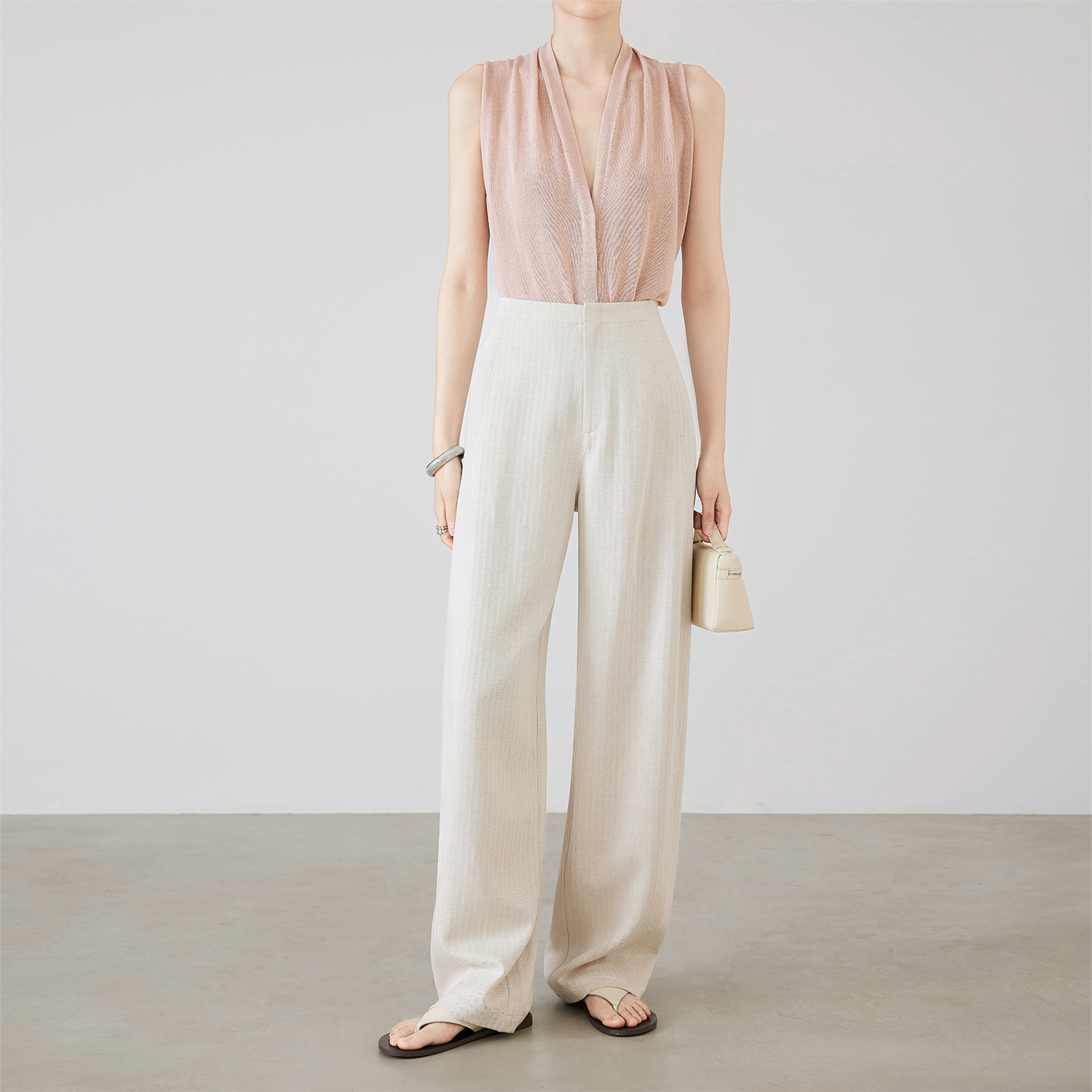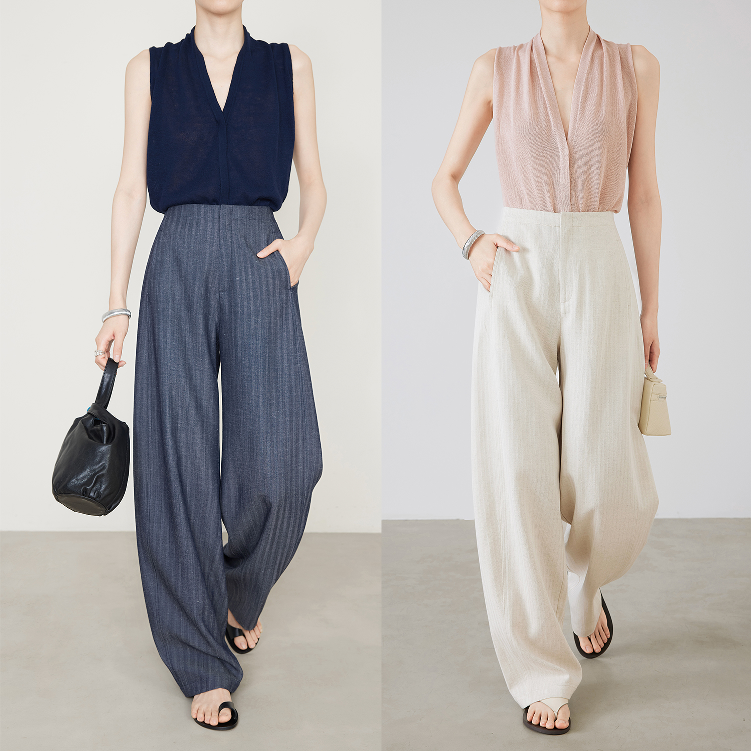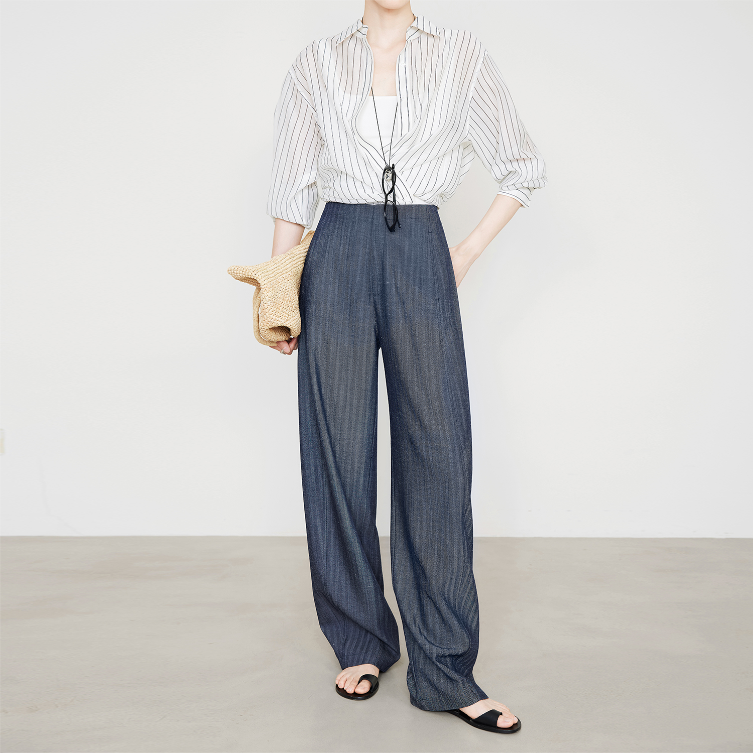 7896 藏青高腰莱赛尔直筒裤 夏莫卡条纹天丝阔腿裤 薄显瘦亚麻休闲裤