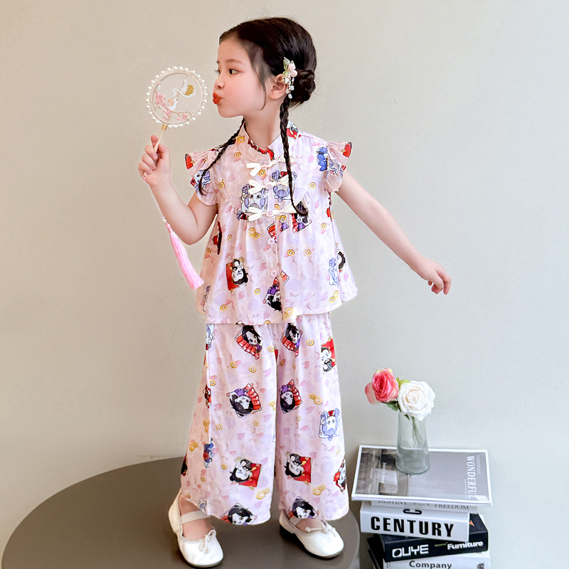 儿童超好看国风绵绸阔腿裤 新款 女宝宝两件套 2025夏季 女童棉绸套装