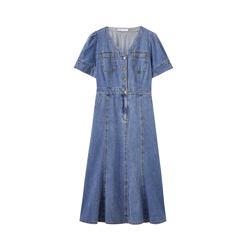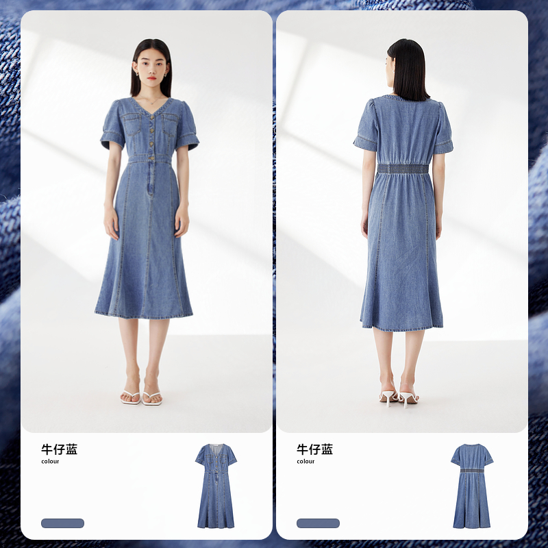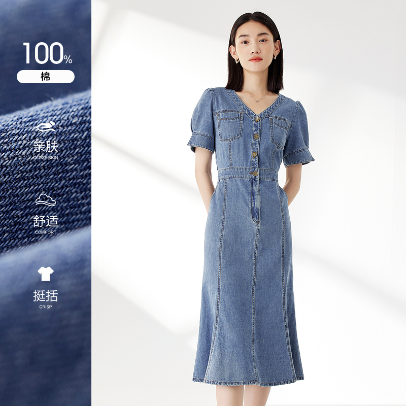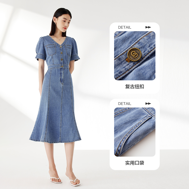 水云间复古蓝牛仔短袖 连衣裙女v领收腰显瘦中长裙子气质港风夏款