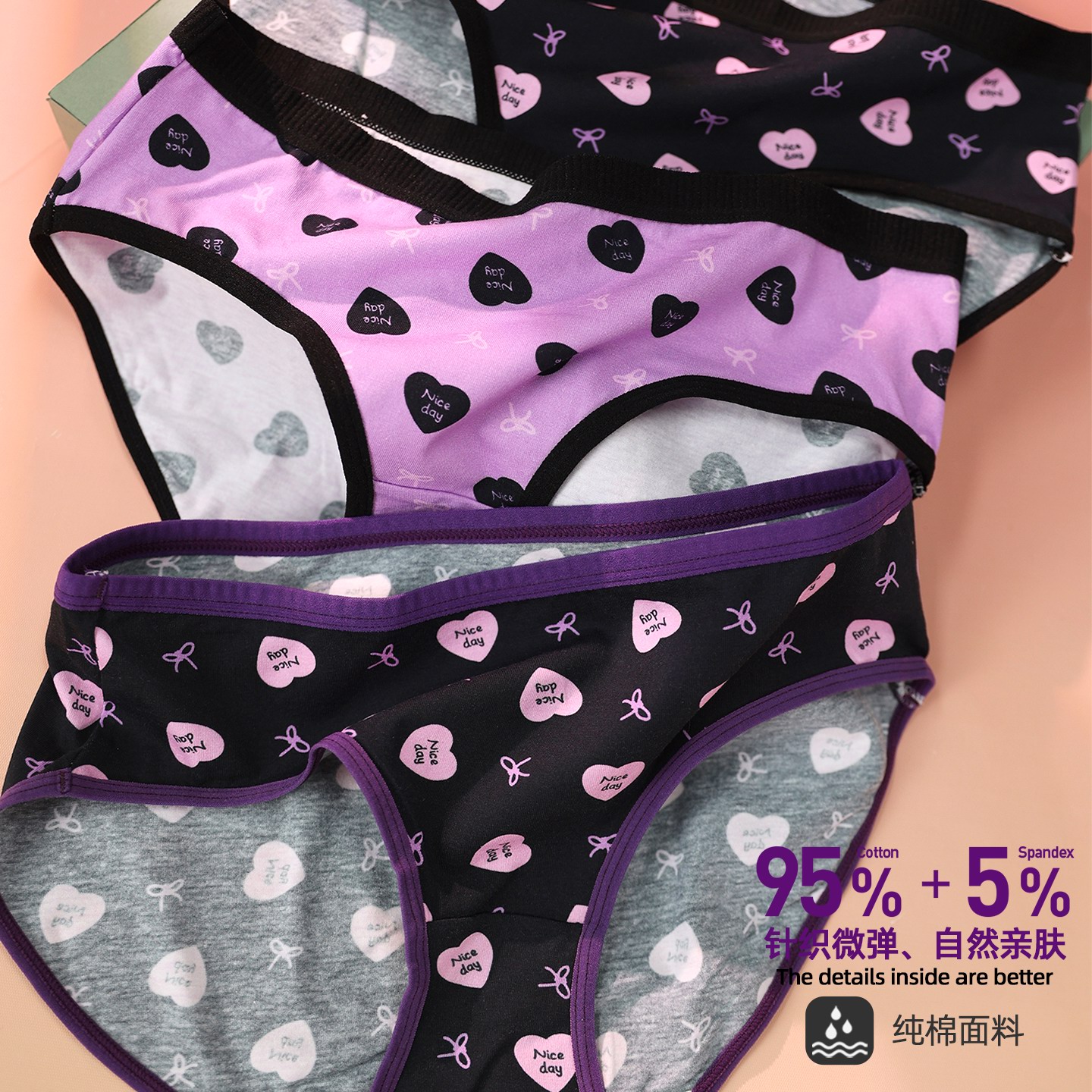 印花中腰收腹宽腰带抑菌裆大码 三角裤 透气 纯棉薄款 粉色爱心女内裤