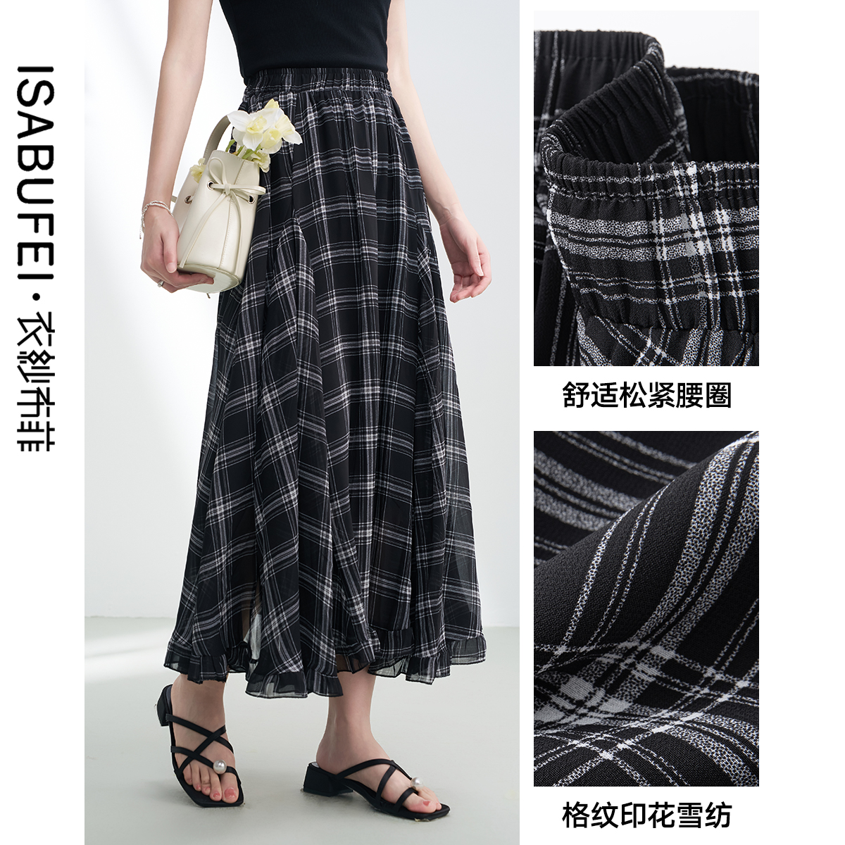 修身 新款 显瘦A字裙 飘逸黑白格纹中长半身裙2025夏季 衣纱布菲简樱