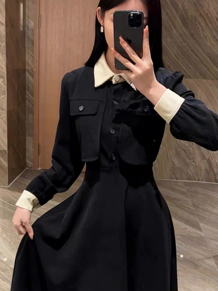 张婧仪同款 圆领连衣裙拼接假两件A1FAF2922 朝夕太平鸟三醋酸法式