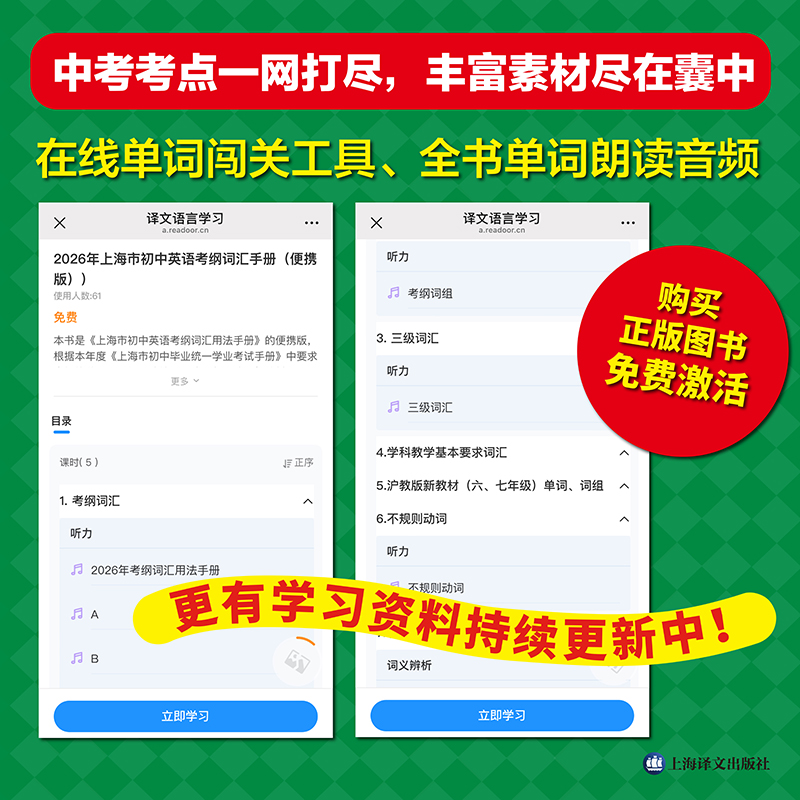 上海市初中英语考纲词汇手册 上海译文出版 便携版 中考英语词汇小本口袋书默写背单词练习 社 中考单词词汇音频扫码 2026版