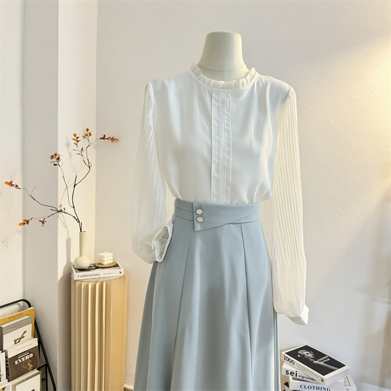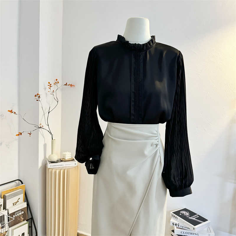 气质通勤灯笼袖 女2024秋设计感法式 上衣 衬衫 黑色木耳花边立领长袖