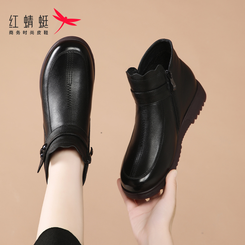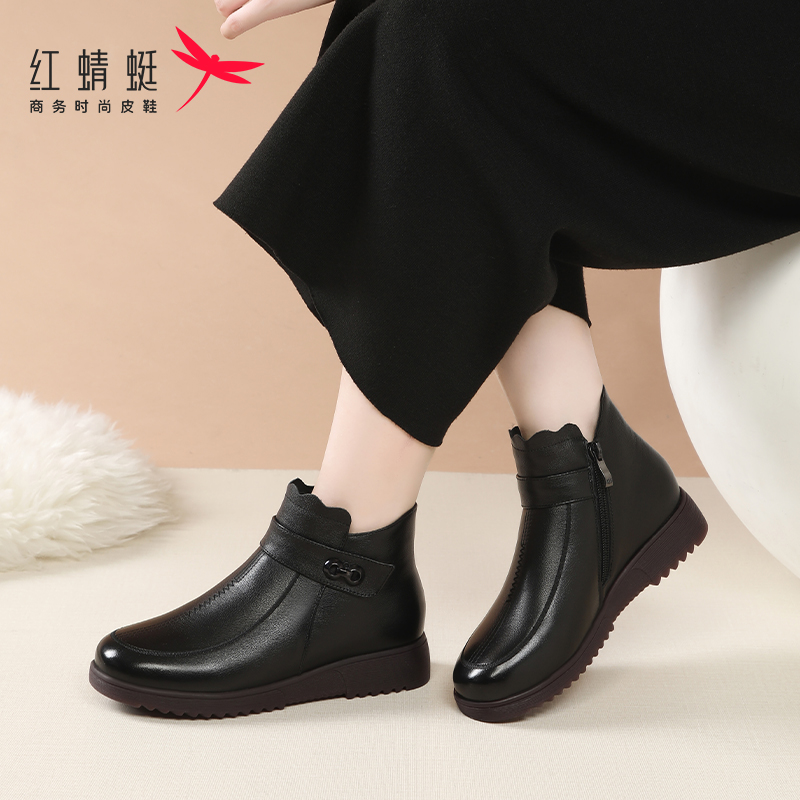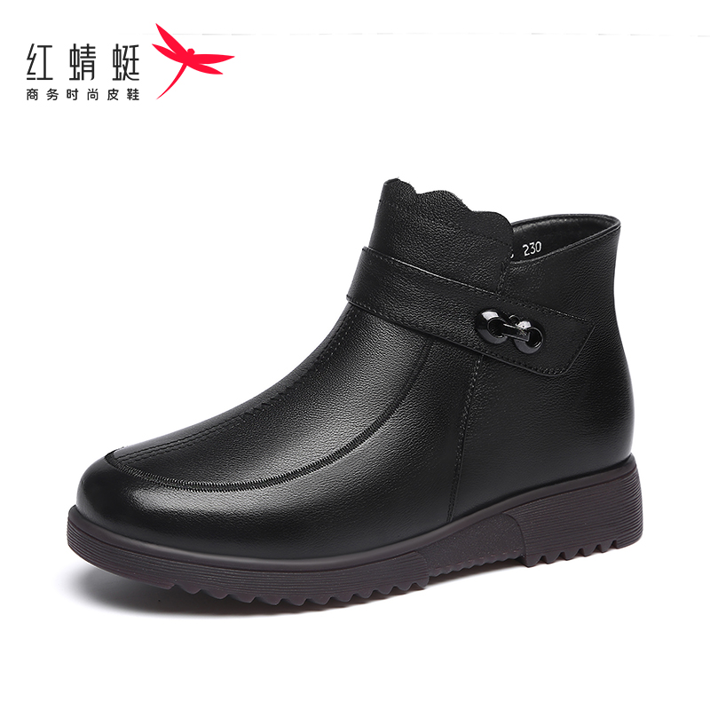 红蜻蜓冬季 短靴棉靴加绒保暖加厚靴子女真皮老人 平底中老年妈妈款