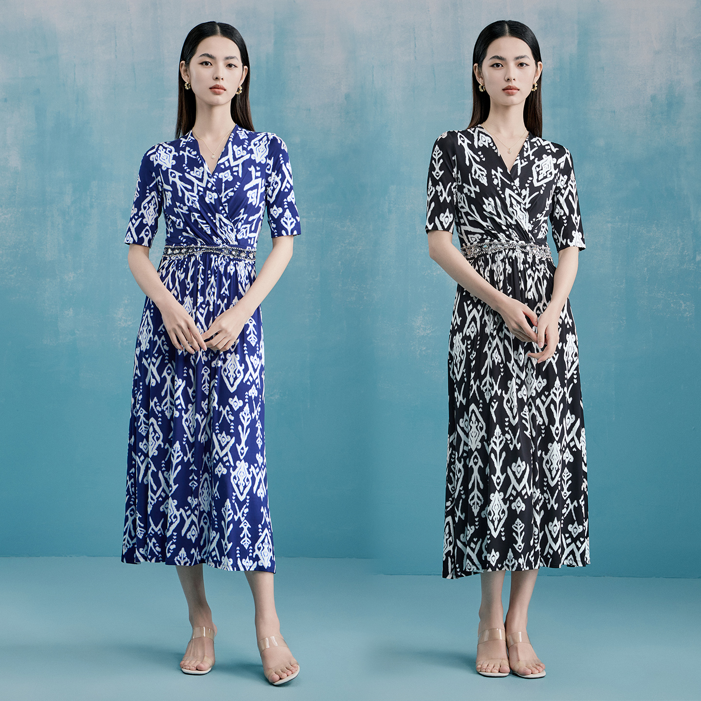 SNIDEL2025春夏新品 优雅露肩流苏收腰挂脖印花连衣裙SWFO251123