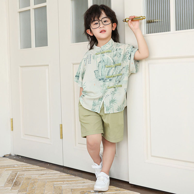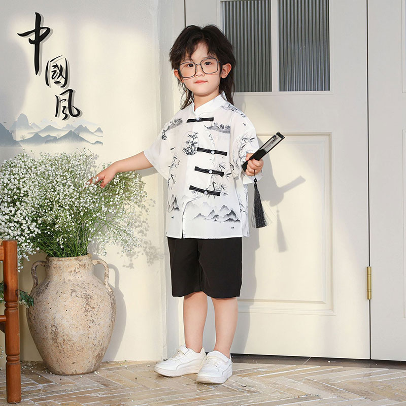 衬衫 套装 童装 夏季 立领时尚 中国风男童短袖 中式 宽松水墨风汉服 新款