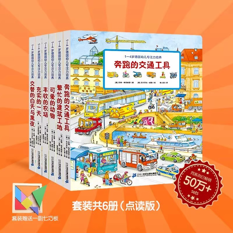 德国幼儿专注力训练培养大书奔跑 直发 交通工具繁忙 建筑工地丰收 6册赠七巧板 农场幼儿专注力绘本点读版 正版