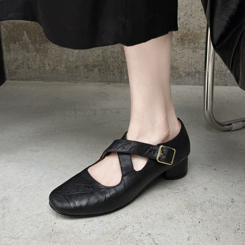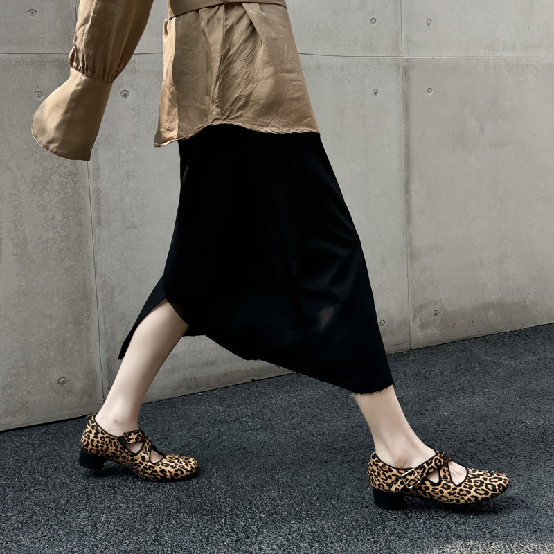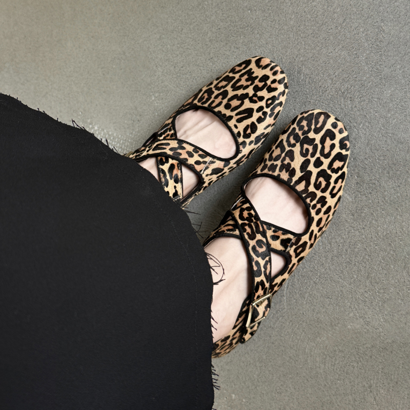 女鞋 豹纹法式 女外穿圆头配裙子粗跟单鞋 头层羊皮交叉带平底芭蕾鞋