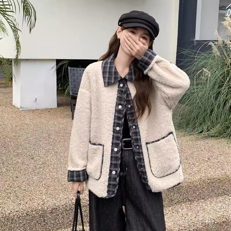 百搭长袖 新款 皮毛一体 宽松2025秋冬季 拼格子羊羔毛外套女休闲韩版