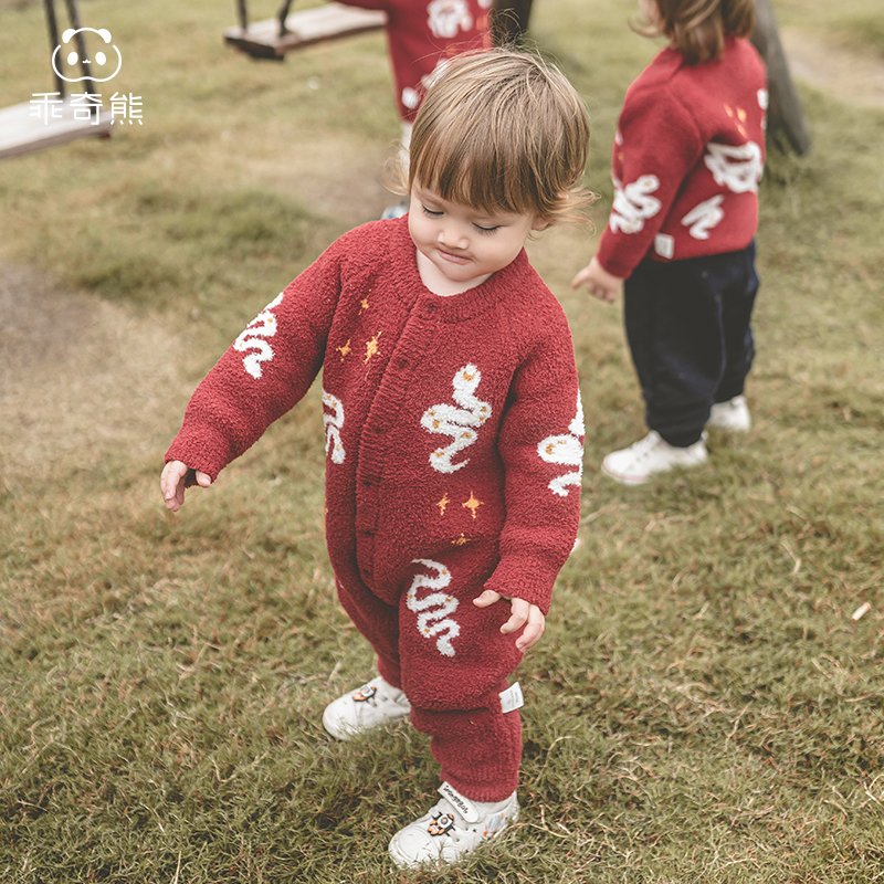 保暖宝宝红色拜新年毛衣服 婴儿针织连体哈衣秋冬季 半边撸猫绒