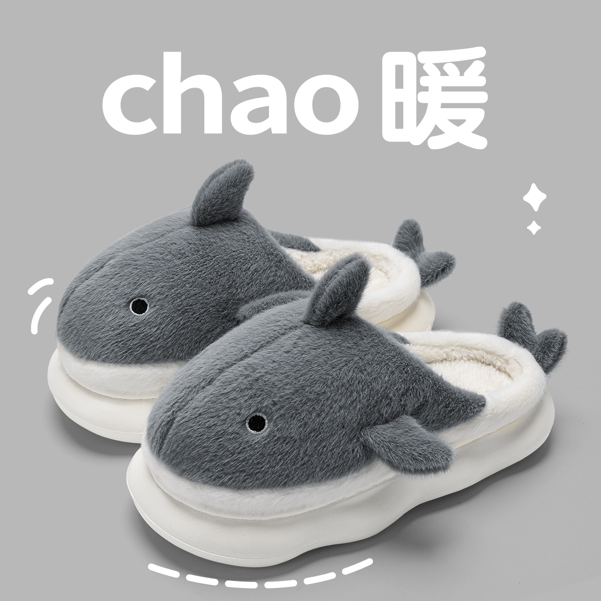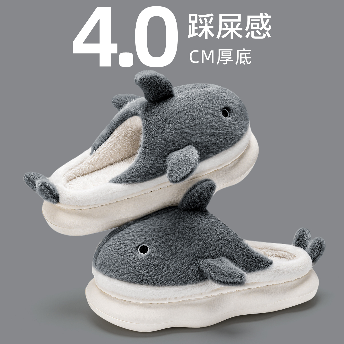 青少年室内家居毛绒可爱厚底鲨鱼棉拖女款 秋冬季 男士 踩屎感棉拖鞋