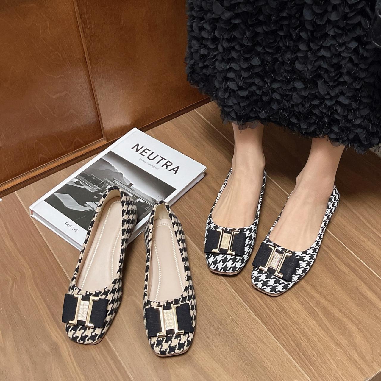 方扣舒适浅口百搭豆豆单鞋 千鸟格方头中跟女鞋 韩版 新款 女 2025春季