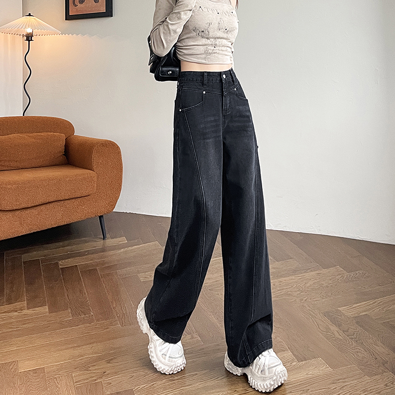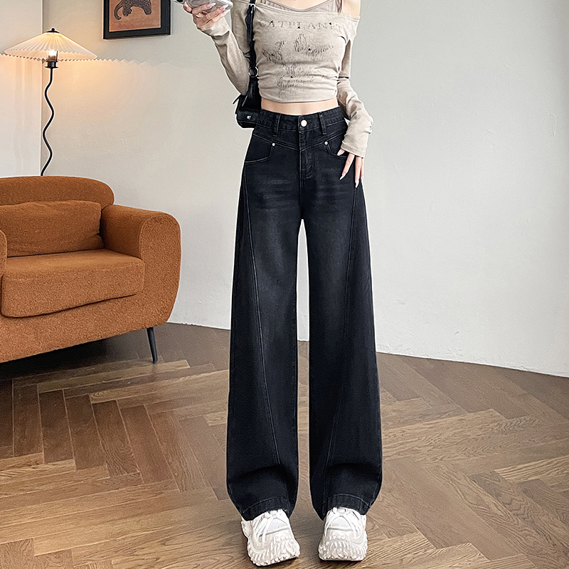 高腰设计感宽松直筒拖地裤 2025年新款 子女 女春秋装 黑色阔腿牛仔裤