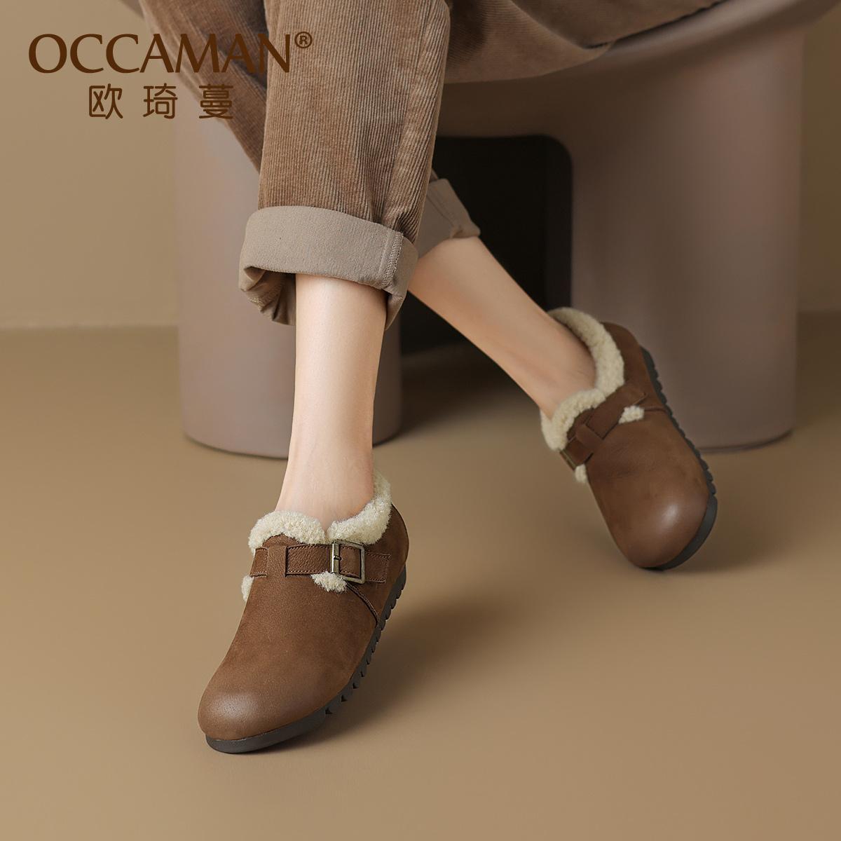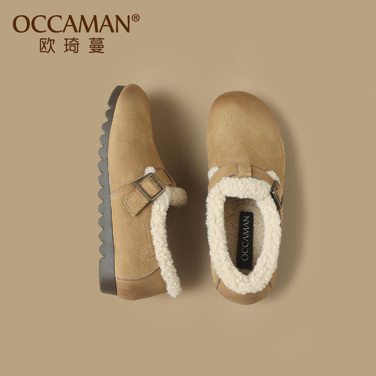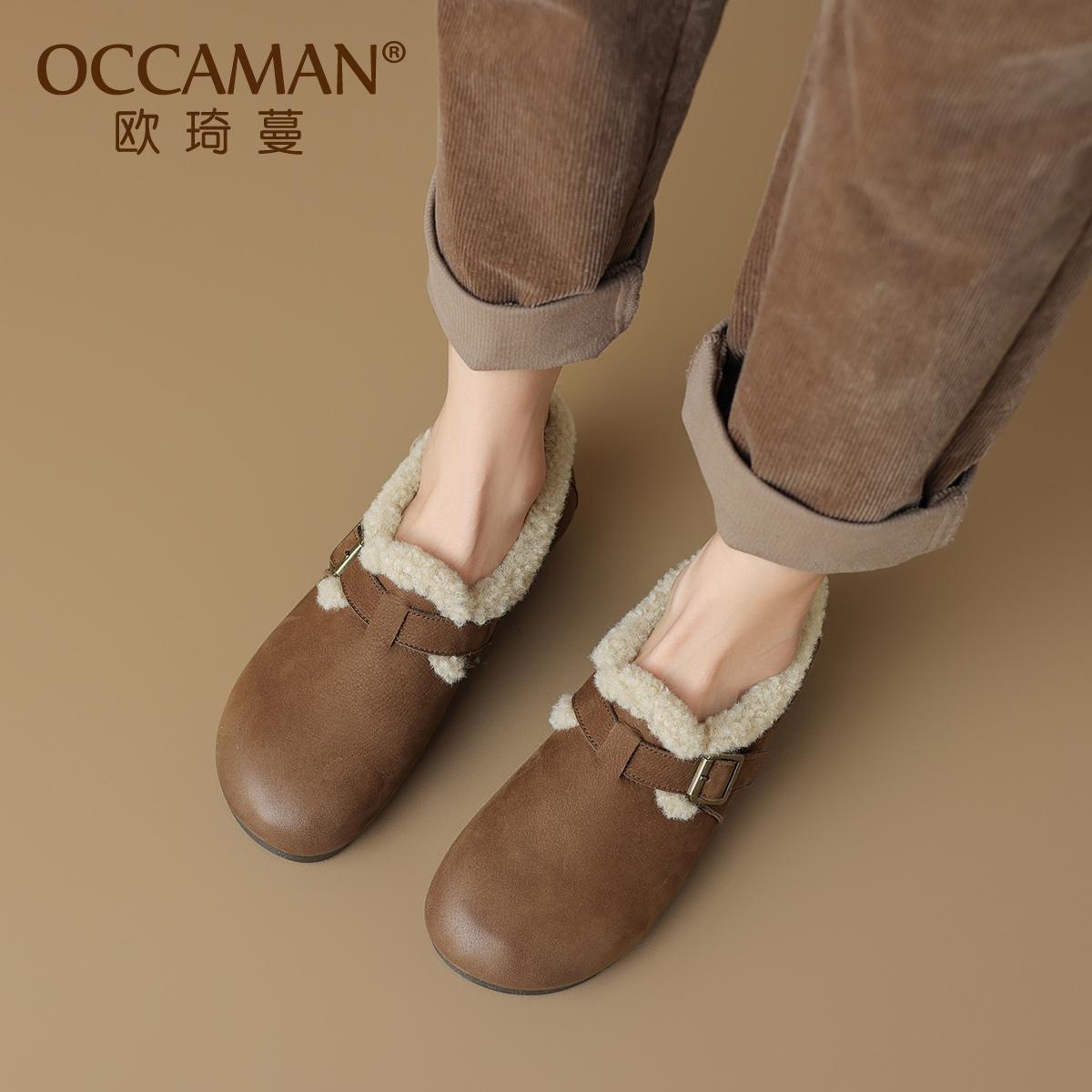复古女鞋 皮带扣秋冬新款 欧琦蔓牛皮加绒保暖平底勃肯鞋 OCCAMAN