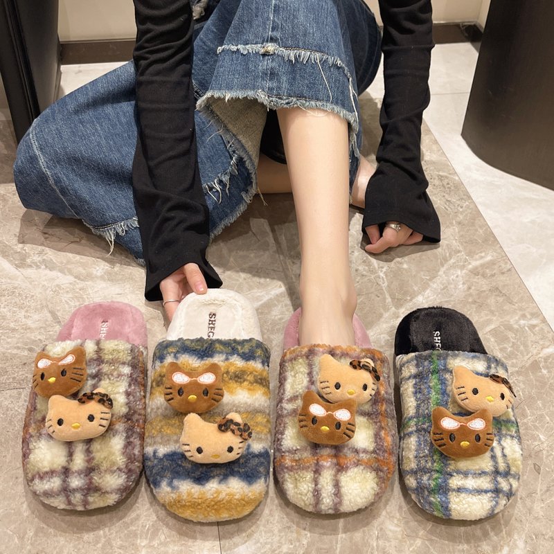 多巴胺可爱凯蒂猫格子棉拖鞋 毛毛拖踩屎感舒适一脚蹬包头拖 女冬季