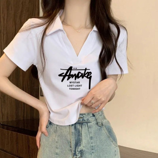短款 螺纹棉Polo领翻领白色短袖 气质v领修身 夏季 百搭上衣女 T恤女装
