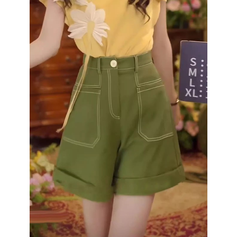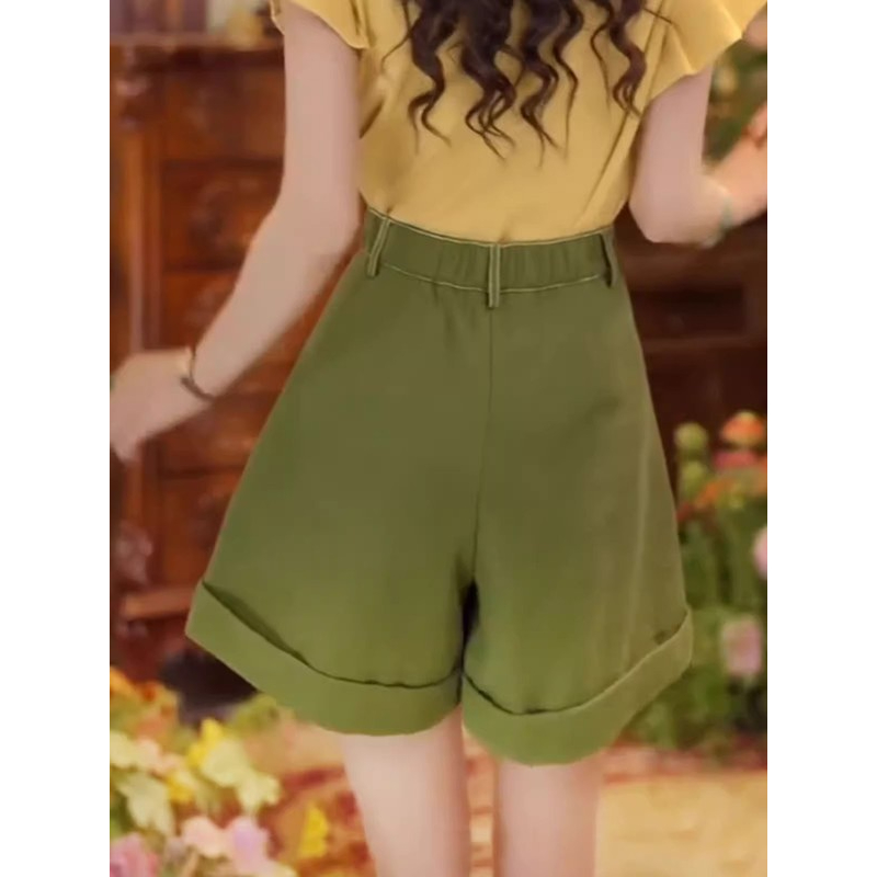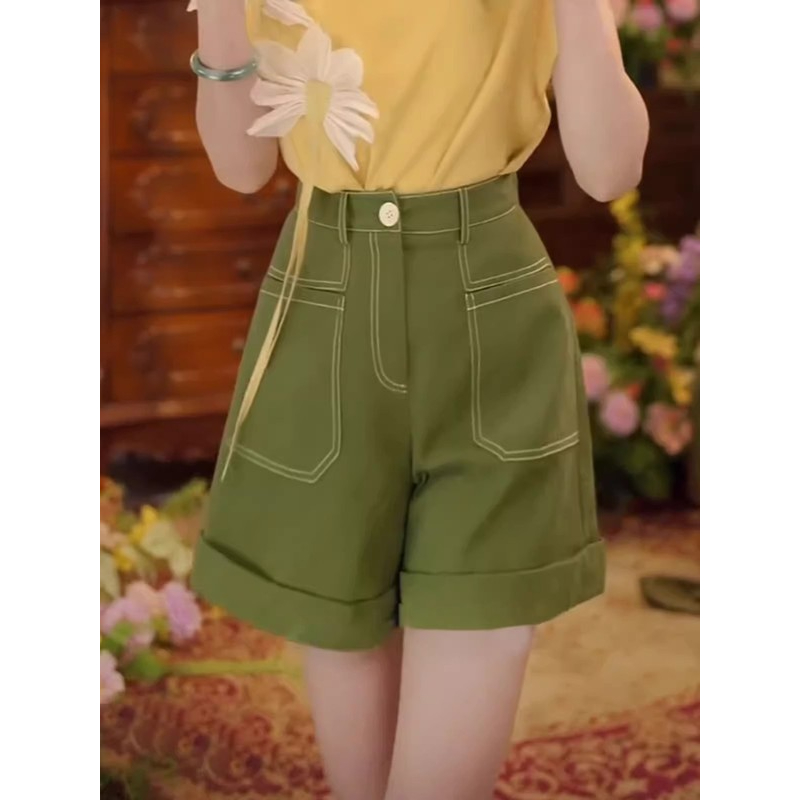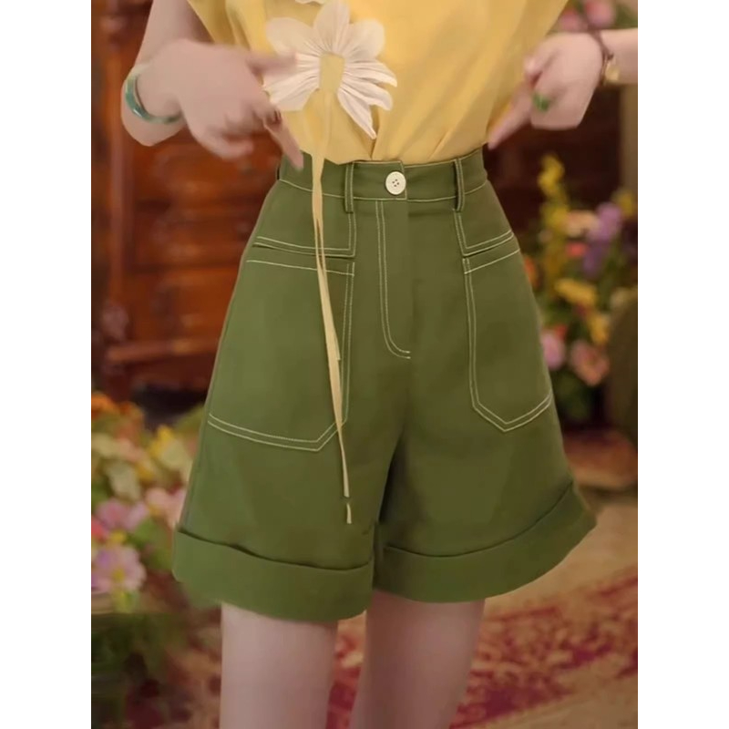 高腰显瘦休闲百搭卷边阔腿裤 夏季 子 女装 2025港风复古绿色A字短裤