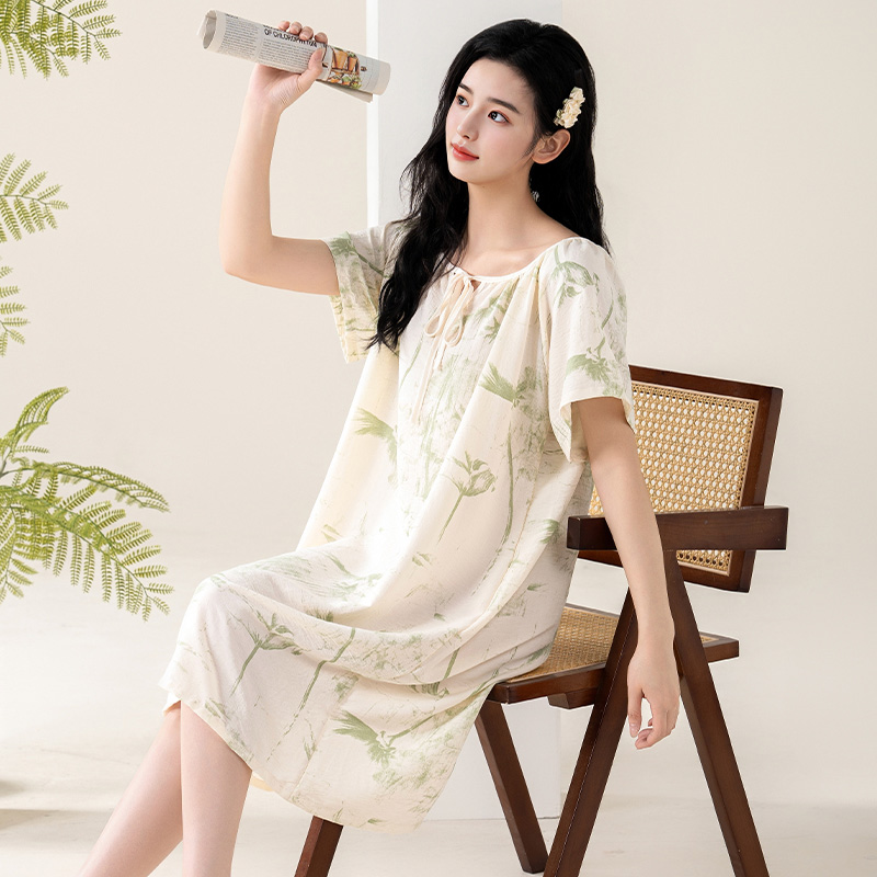 睡衣夏季 韩版 加大码 棉绸睡裙女士短袖 人造棉宽松舒适居家服 加长款