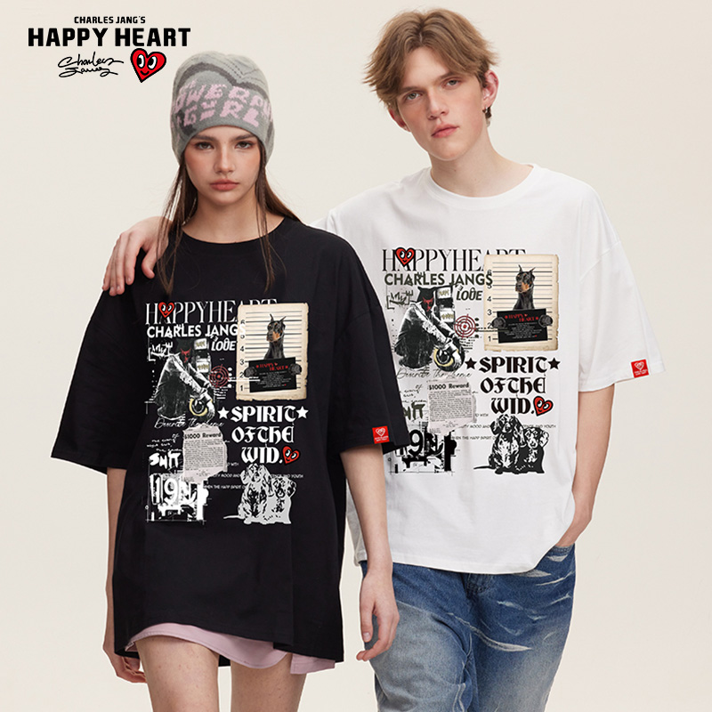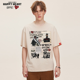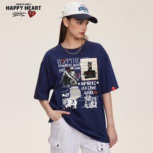 t恤男情侣同款 复古潮流小狗印花纯棉圆领休闲短袖 美式 查尔斯桃心