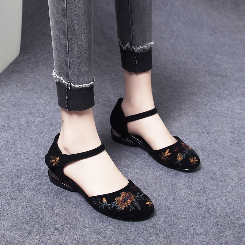 新款 羊皮刺绣平底鞋 真皮软底妈妈鞋 女一字带夏款 包头凉鞋 2025夏季