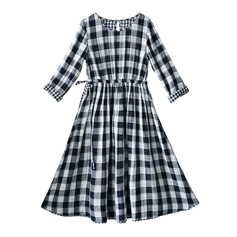 宽松腰套头大摆型长裙 双层复合棉格子连衣裙2025春季 忆旧 如愿