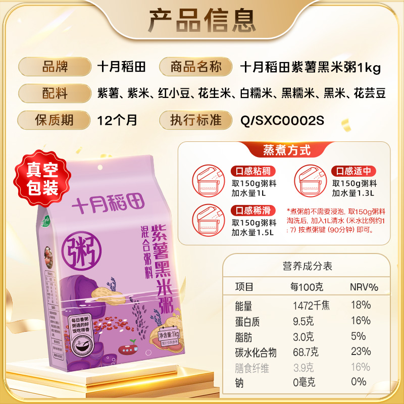 五谷杂粮粗粮早餐主食粥 十月稻田紫薯黑米粥 真空包装 半日达