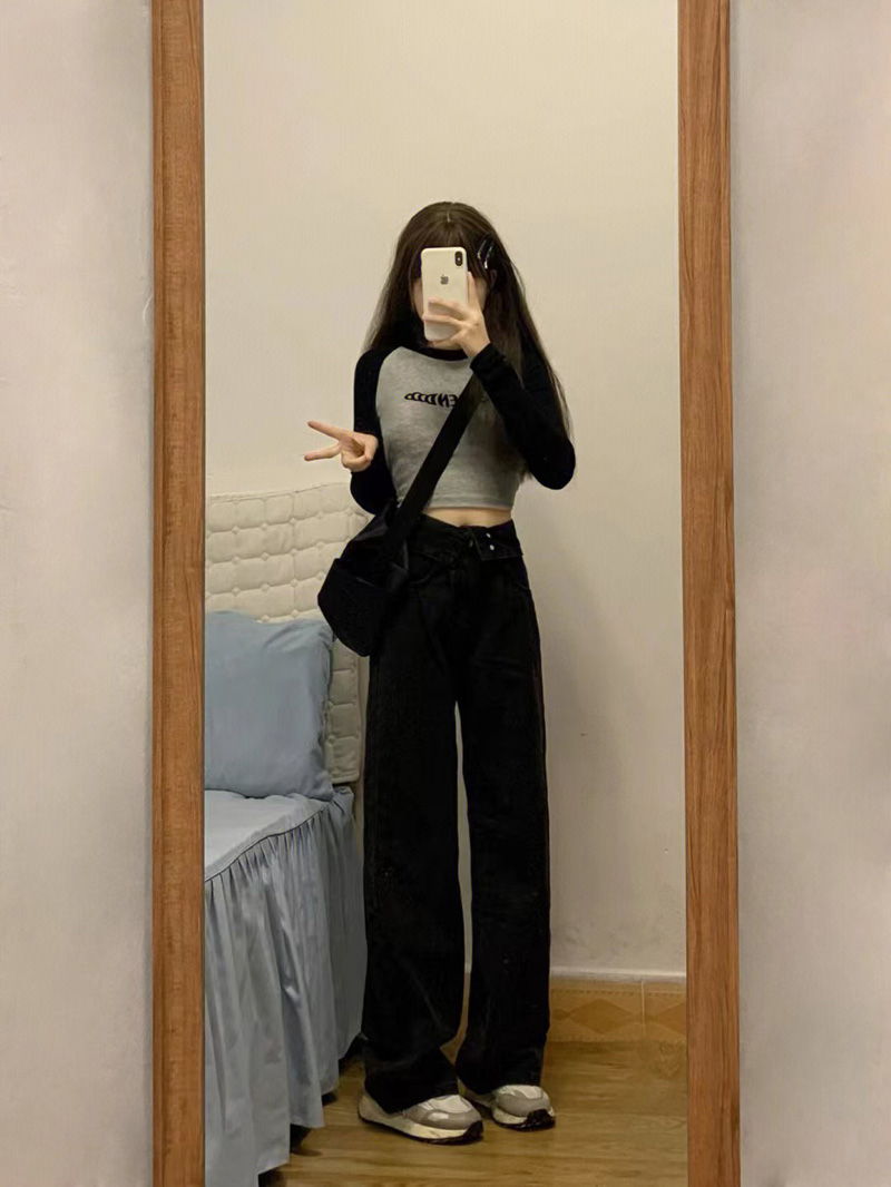 高腰露脐紧身上衣服 打底衫 设计感小众拼色长袖 T恤女春秋内搭短款
