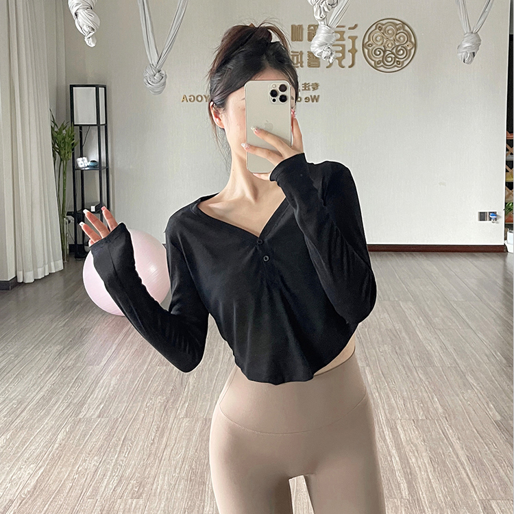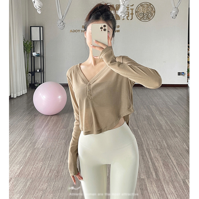 运动上衣露脐健身服 瑜伽服短款 长袖 T恤女v领健身衣罩衫