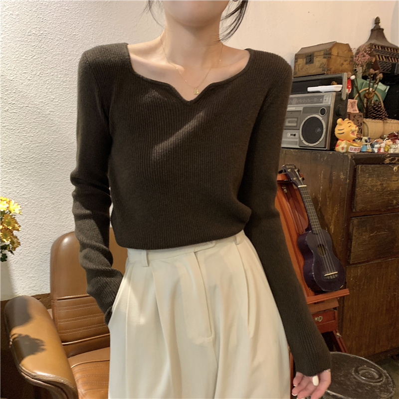 设计感小众短款 春秋冬薄款 打底针织衫 紧身长袖 内搭毛衣女 v领修身