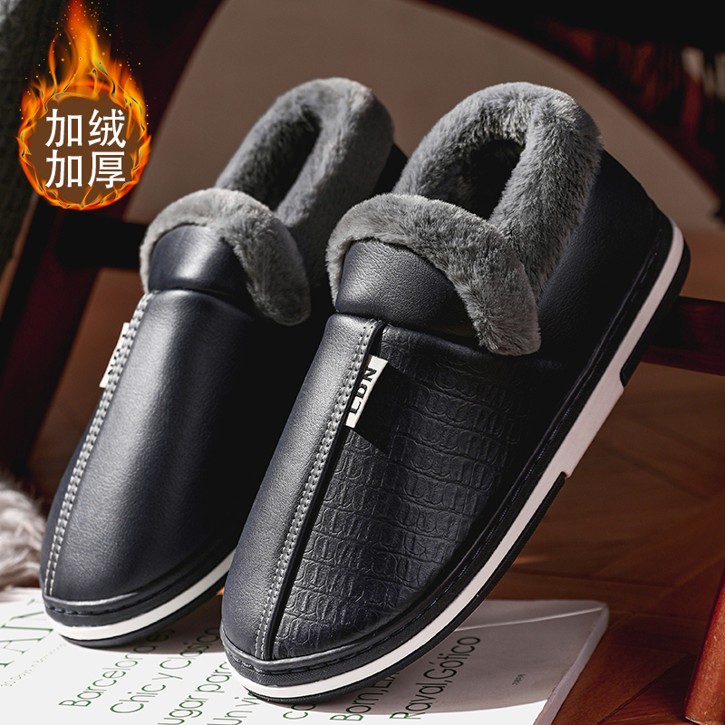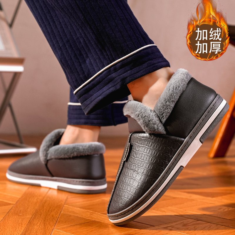 外穿加绒保暖防水防滑居家居皮面老人棉鞋 男冬季 爸 包跟棉拖鞋 男士