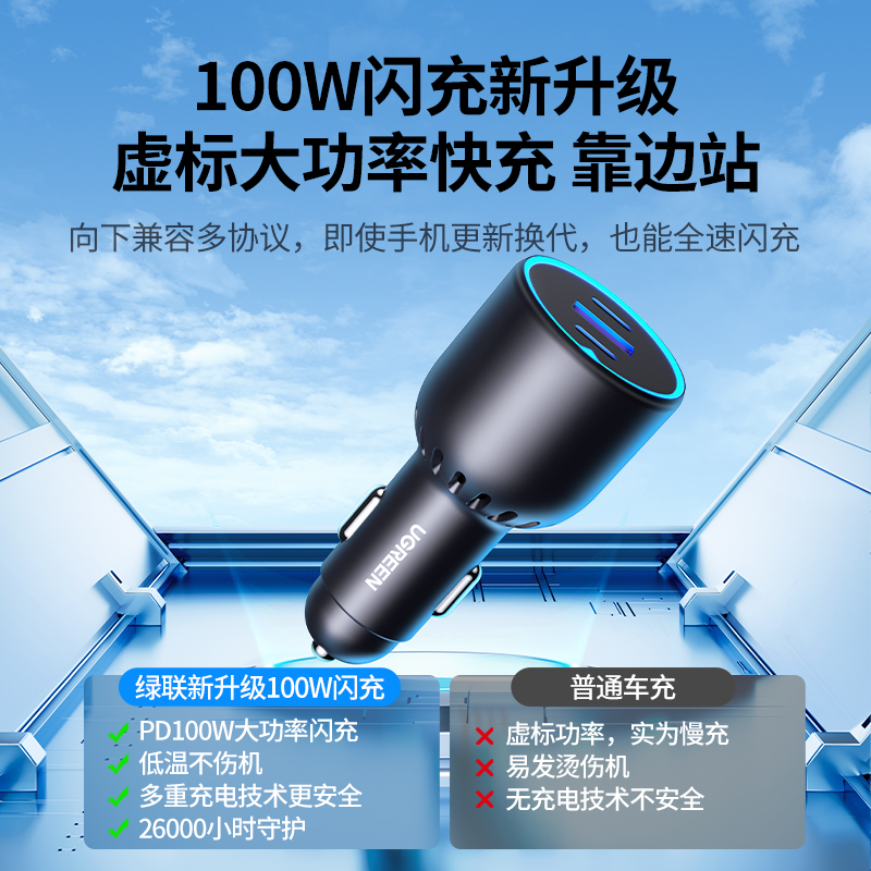 绿联130W车载充电器适用苹果华为荣耀笔记本手机69W超级快充插头