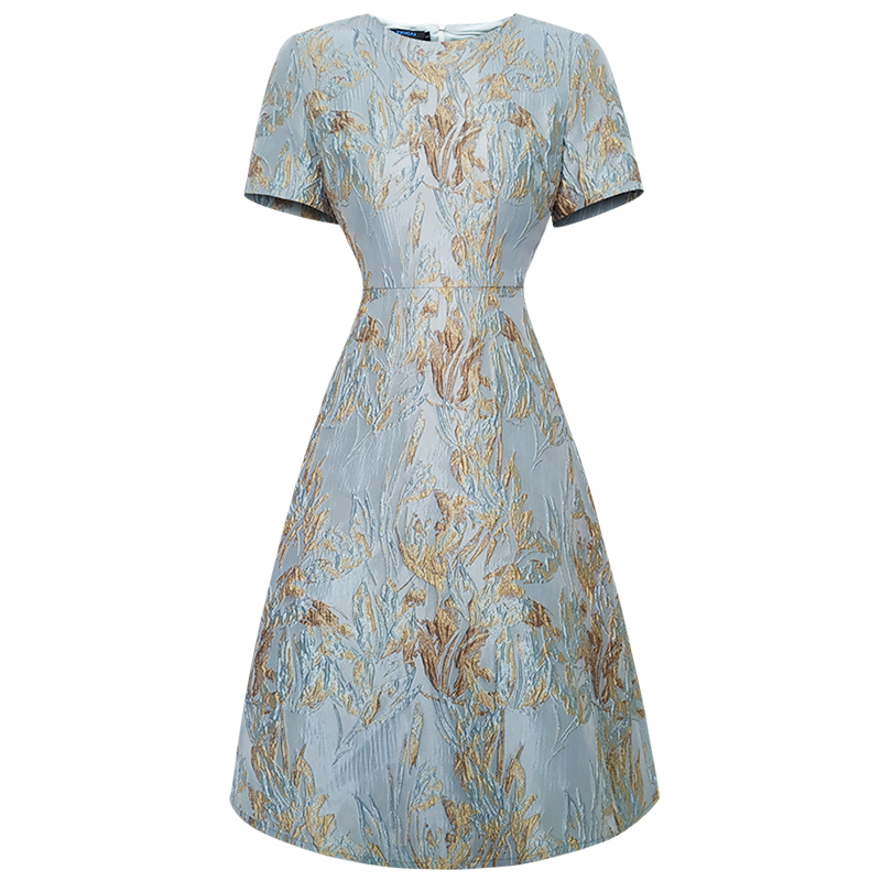 秋季 提花蓝色气质优雅收腰连衣裙小众派对a字裙2801 新款