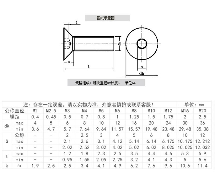 304不锈钢沉头内六角螺丝平头螺丝螺钉平杯螺栓M2M3M4M5M6M8 m20