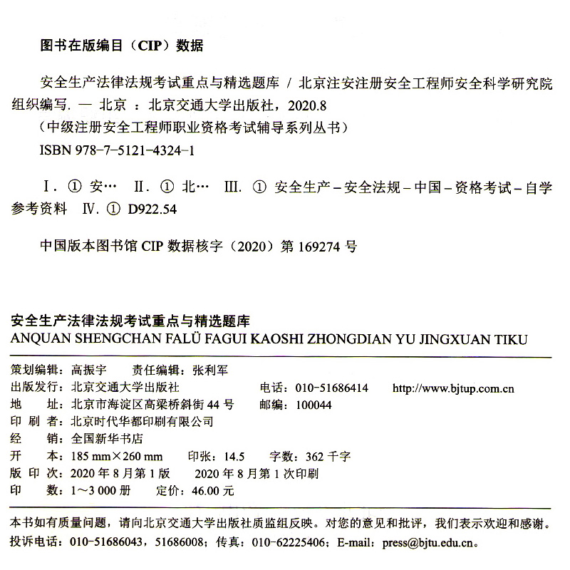 正版 社 书籍 北京交通大学出版 安全生产法律法规考试重点与精选题库