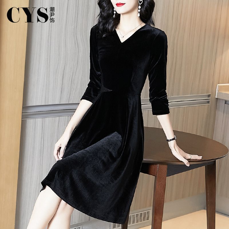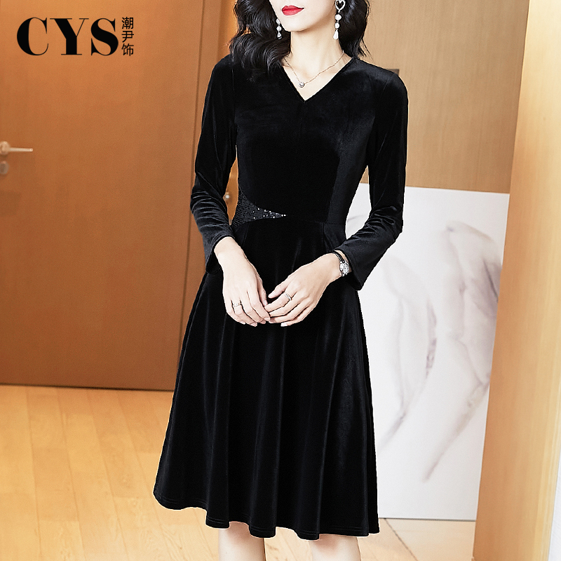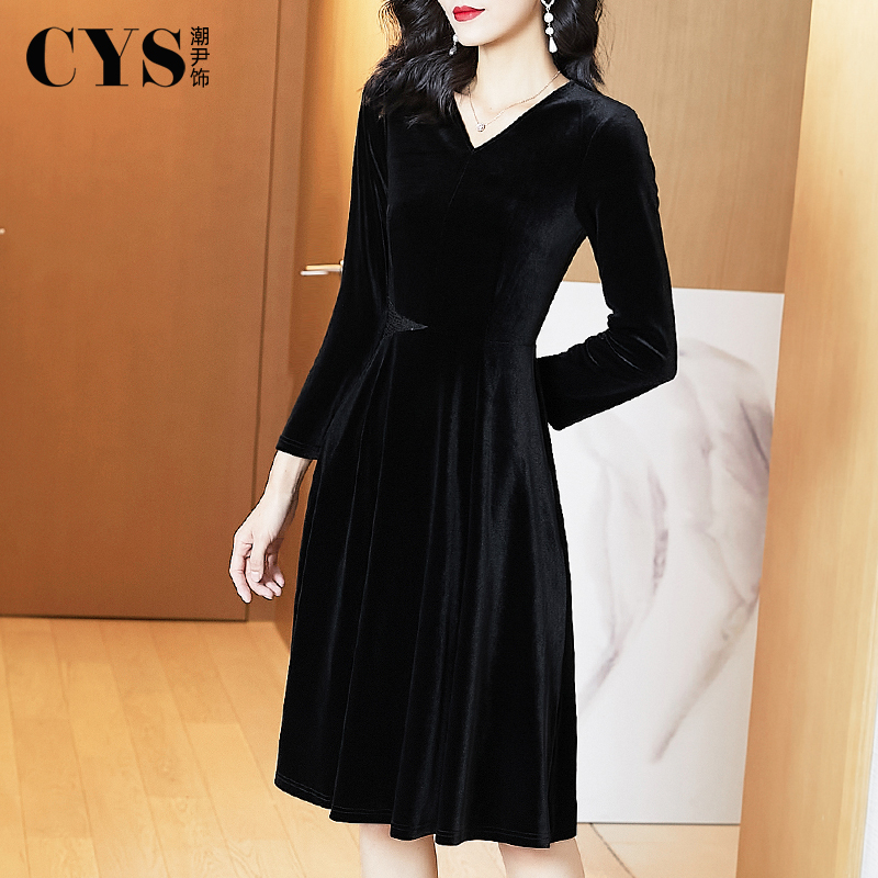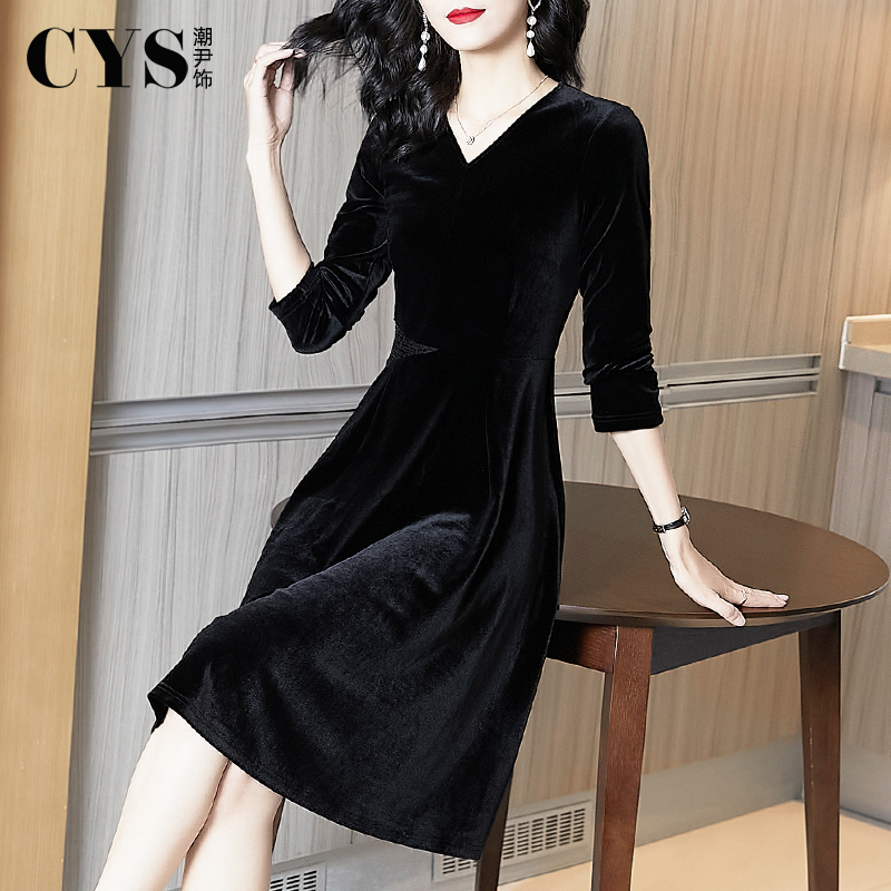 金丝绒连衣裙2025年秋季 高贵洋气v领气质丝绒礼服裙子女秋冬 新款