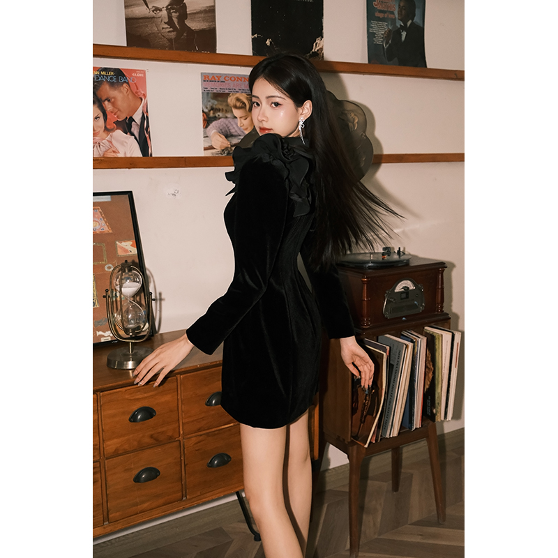 乐町miu系假两件长袖 格雷系学院风花边半高领连衣裙 连衣裙秋新款