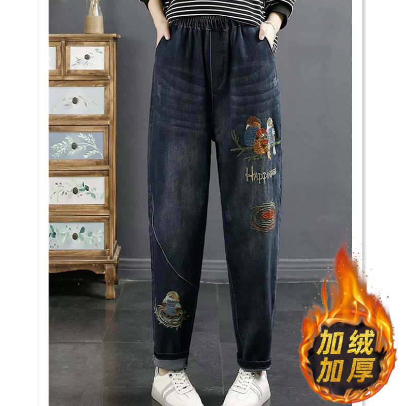 加绒直筒裤 春秋弹力宽松显瘦冬季 子 女2025年新款 松紧腰阔腿牛仔裤