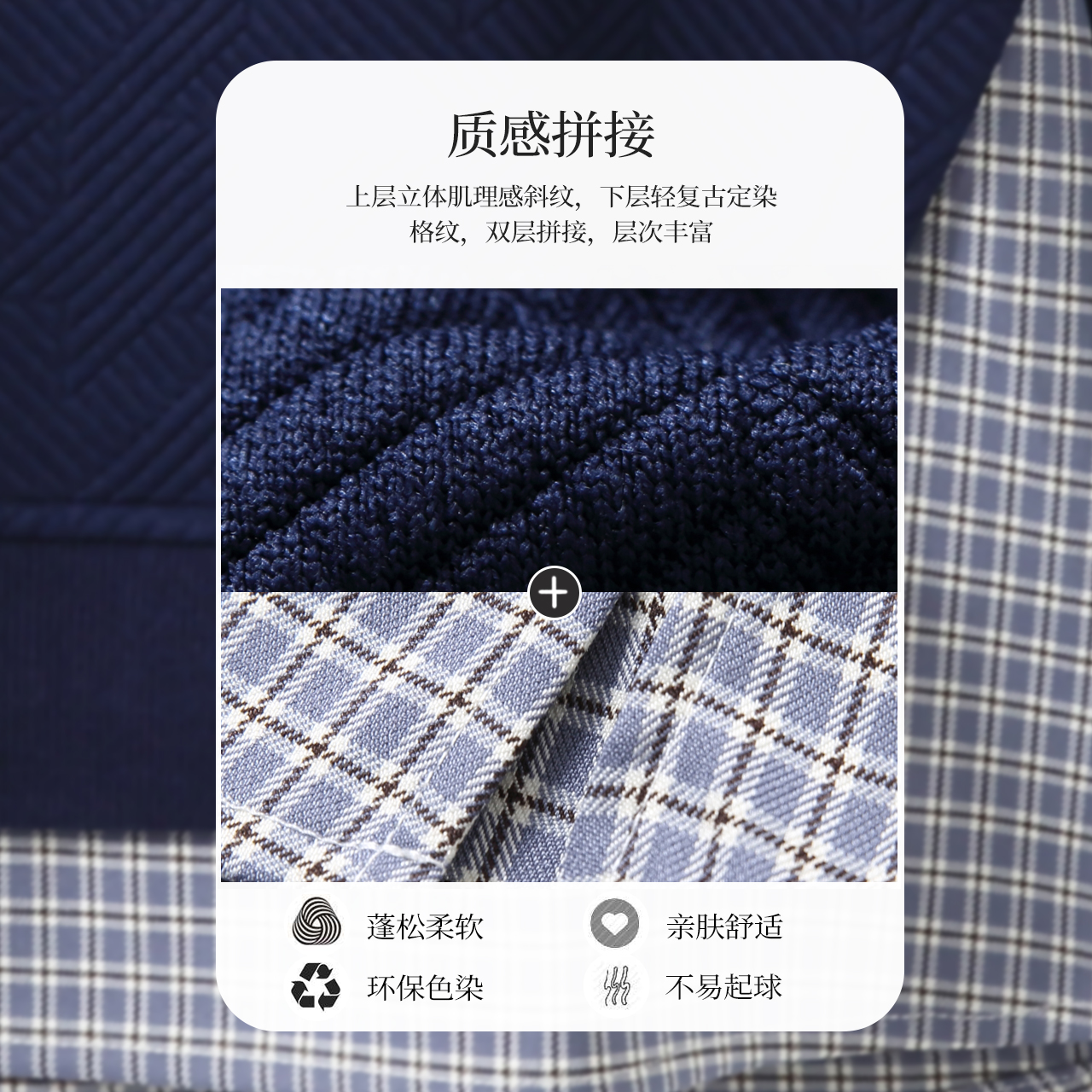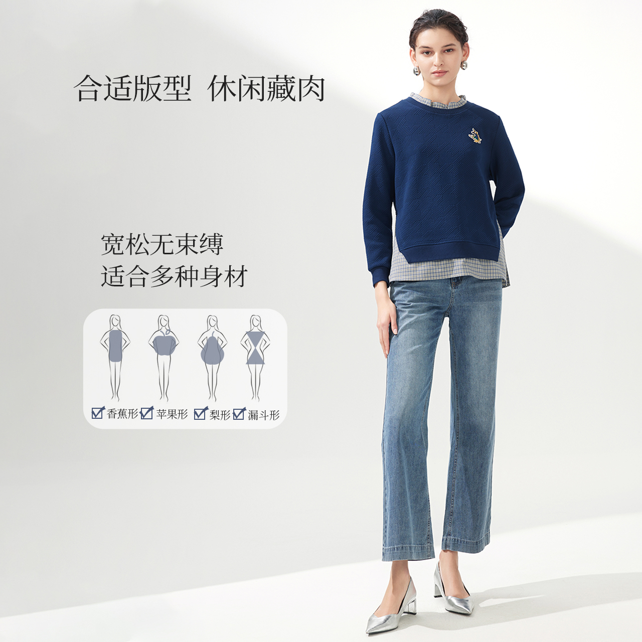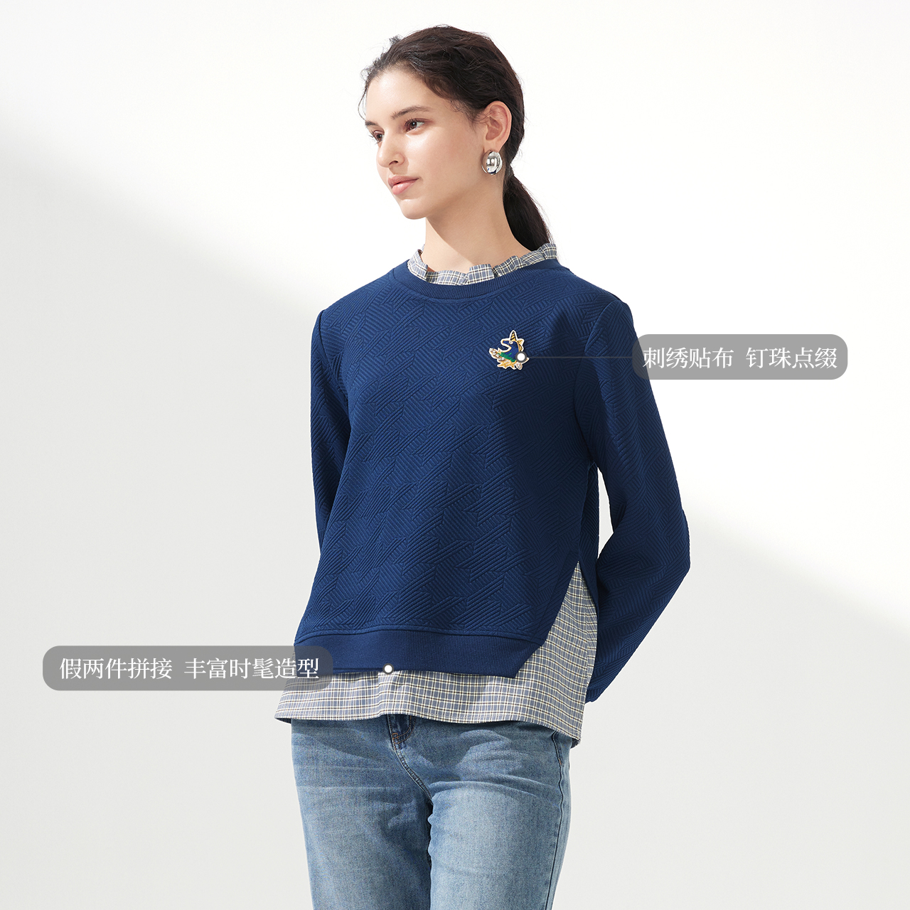 菲妮迪T恤2025秋新款 假两件设计感显瘦休闲气质圆领针织上衣女